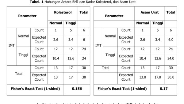 Meski demikian, analisis statistik menunjukkan bahwa tidak terdapat hubungan signifikan antara IMT dengan kadar kolesterol maupun asam urat pada pasien diabetes.